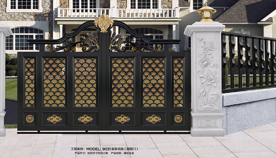 別墅庭院大門材質(zhì)選用高端硬鋁合金型材,以及整體實心鑄鋁花件,純手工拼接制作而成。